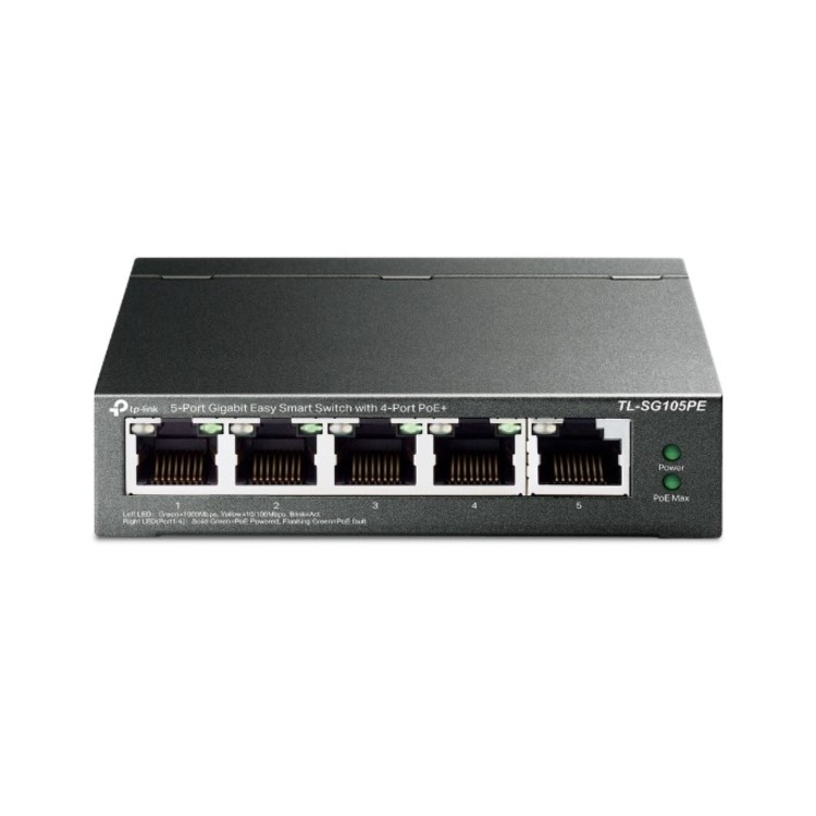 The TL-SG105PE is an 5-port Gigabit Easy Smart Switch with 4 PoE+ ports, represents a powerful upgrade from an unmanaged switch. It is designed specially for small businesses that require simple network management and PoE function. The TL-SG105PE can connect and power up to four PoE devices, such as wireless access points (APs), IP cameras, and IP phones. Through its web-based user interface and management utility, the TL-SG105PE offers a variety of useful features, including network monitoring, traffic prioritization, PoE Auto Recovery and enhanced QoS. Additionally, with port-based, tag-based and MTU VLAN, TL-SG105PE can improve security and meet more network segmentation requirements.<br><br><b>Power Over Ethernet</b><br>4 of the 5 Auto-Negotiation RJ45 ports (port 1 to port 4) of the switch support Power over Ethernet (PoE) function. These PoE ports can automatically detect and supply power with those IEEE 802.3af/at compliant Powered Devices (PDs).<br><br><b>Overload Arrangement</b><br>TL-SG105PE has the priority function which will help protect the system when the system power is overloaded. If all PoE PDs power consumption is >= 65 W, a priority will be arranged among the PoE ports, then the system will cut off the power of the lowest-priority port.<br><br><b>Intelligent Power Management</b><br>Priority (port 1>port 2>port 3>port 4): This function will help protect the system if the system power becomes overloaded. For example, Port 1, 2 and 4 are consuming 15.4 W respectively. If an additional PoE device with 20 W is inserted to port 3, the system will cut off the power of port 4 to compensate for the overload.<br><br><b>Effective Management</b><br>TL-SG105PE offers network monitoring for users to observe traffic behavior. Through its web-based user interface and management utility, the TL-SG105PE offers a variety of useful features, including network monitoring, traffic prioritization, PoE Auto Recovery and enhanced QoS.<br>With Port Mirroring, Loop Prevention and Cable Diagnostics features, TL-SG105PE can identify and even locate connection problems on your business network. Also, administrators can designate the priority of the traffic based on Port Priority, 802.1P Priority and DSCP Priority, to ensure that voice and video are always clear, smooth and lag-free.<br>Additionally, to improve security and network performance, TL-SG105PE supports MTU VLAN, port-based VLAN and 802.1Q-based VLAN functions. PoE Auto Recovery automatically reboots your dropped or unresponsive PoE-powered devices.<br>TL-SG105PE is an upgrade from the plug-and-play Unmanaged Switch, delivering great value while empowering your network and similarly delivering great value to the end user.<br><br><b>Easy to Use</b><br>TL-SG105PE is easy to use and manage. Auto MDI/MDI-X crossover on all ports eliminate the need for crossover cables or uplink ports. Auto-negotiation on each port senses the link speed of a network device (either 10, 100, or 1000 Mbps) and intelligently adjusts for compatibility and optimal performance. Its compact size makes it ideal for desktops with limited space. Dynamic LED lights provide real-time work status display and basic fault diagnosis.