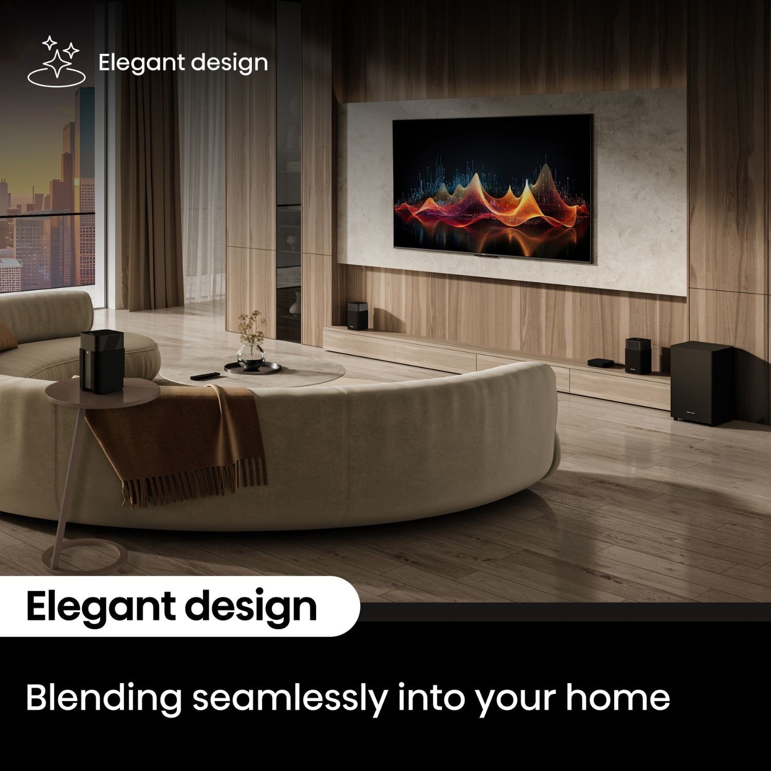 A home theater system designed to blend seamlessly into your come,with wireless speakers that can be wall-mounted or free-standing.