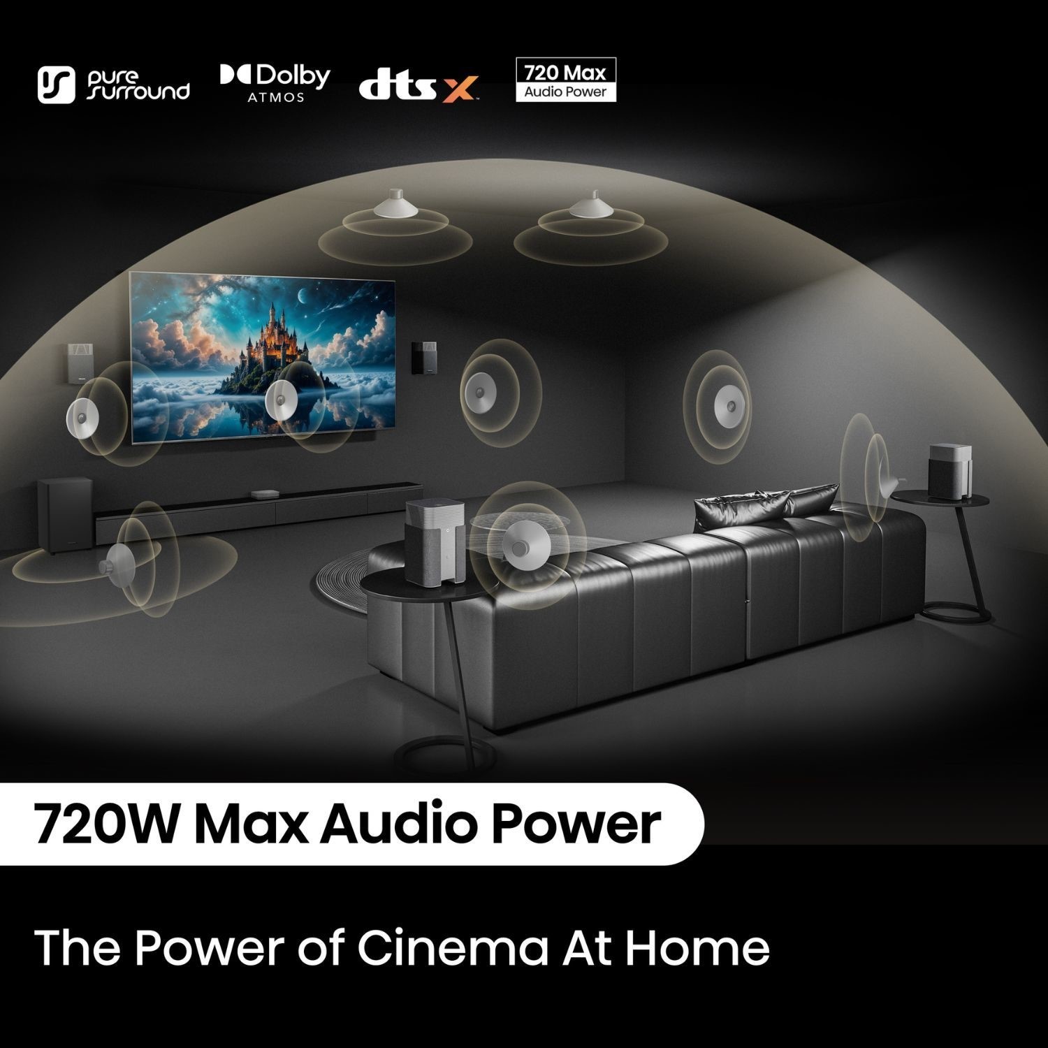 Immerse in cinema-quality sound with advanced surround technology. Exclusive algorithms ensure distortion-free audio, while Dolby Atmos and DTS:X create a 3D soundscape. Experience every detail and transform your home into a cinematic experience with 720W powerful speakers.