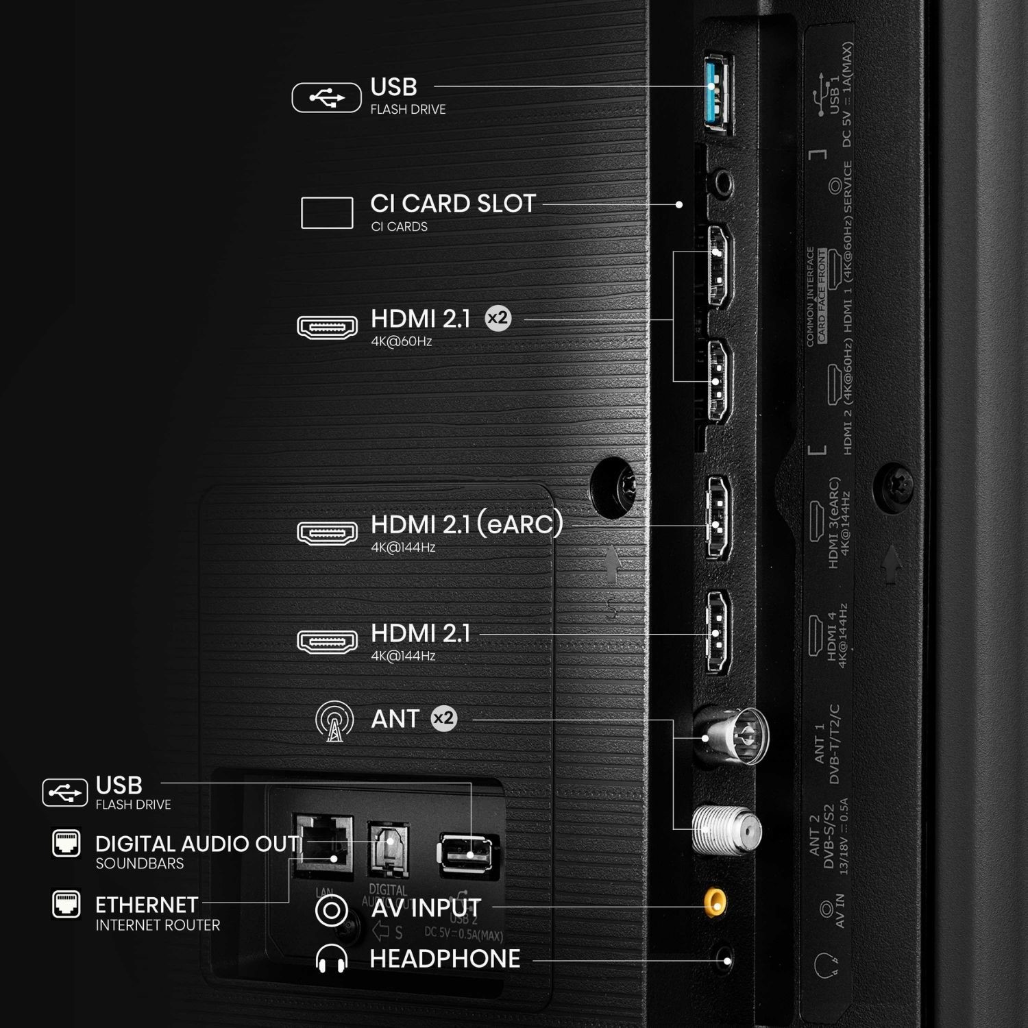A built-in 2.1 channel subwoofer delivers rich, immersive audio with deep bass. Combined with Dolby Atmos and DTS Virtual X, it creates a cinematic soundstage without needing extra speakers, letting you feel every explosion, whisper and musical note.