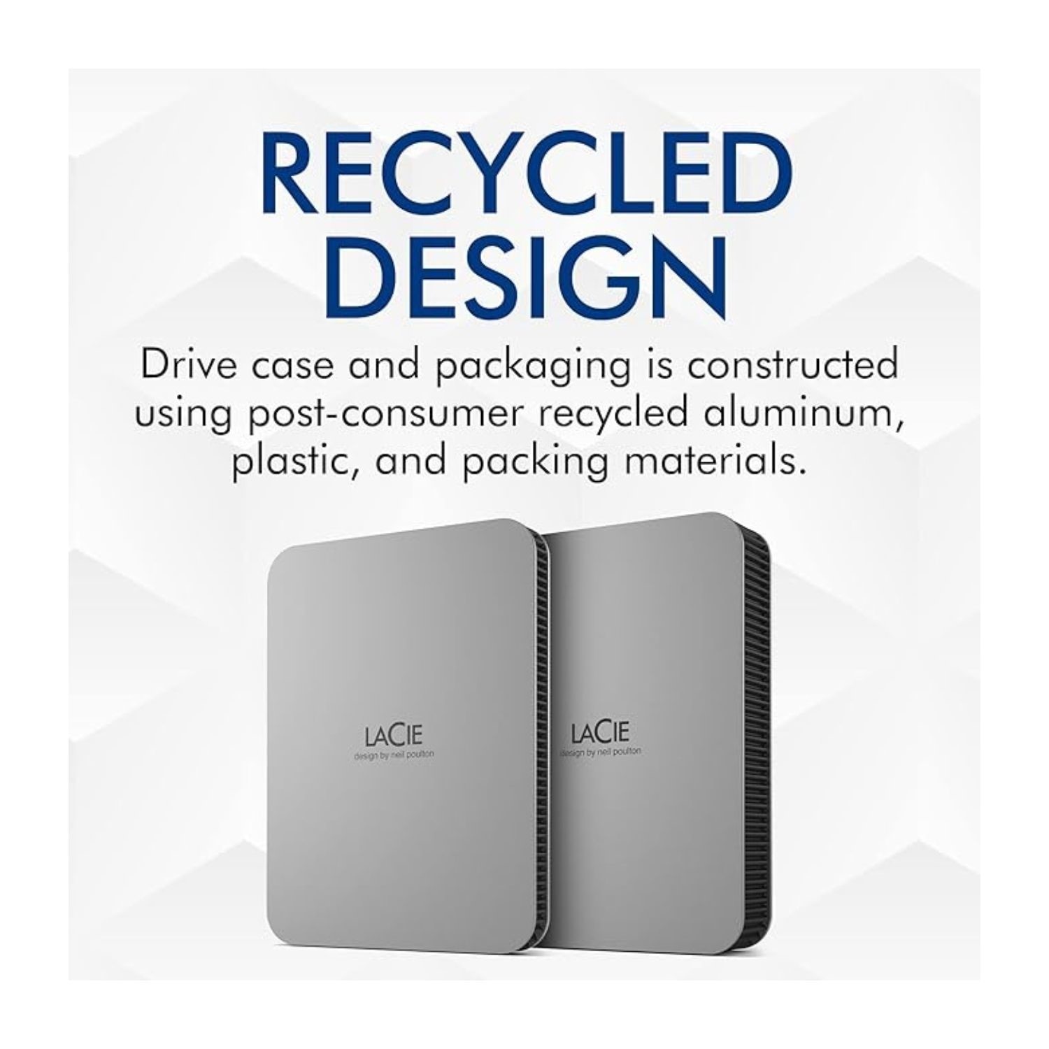 Like an airy loft or vast landscape, LaCie Mobile Drive articulates the beauty and importance of premium space. Featuring a minimalist design with clean, laser etching — each Mobile Drive contains a minimum of 25% recycled materials (recycled plastic and aluminium measured by weight). Works with PC, Mac, and iPad USB-C1, simply plug-in and go. One-click or automatic backup makes file storage extra smooth, plus up to 5 TB of capacity makes plenty of room for photos, playlists, docs and more.