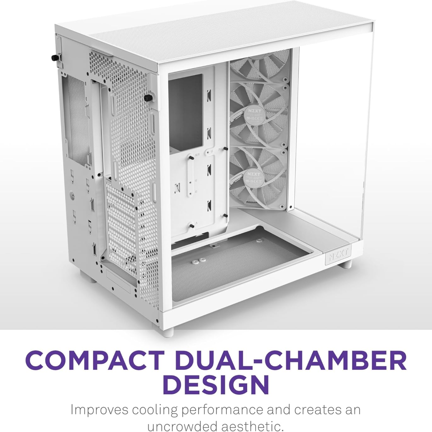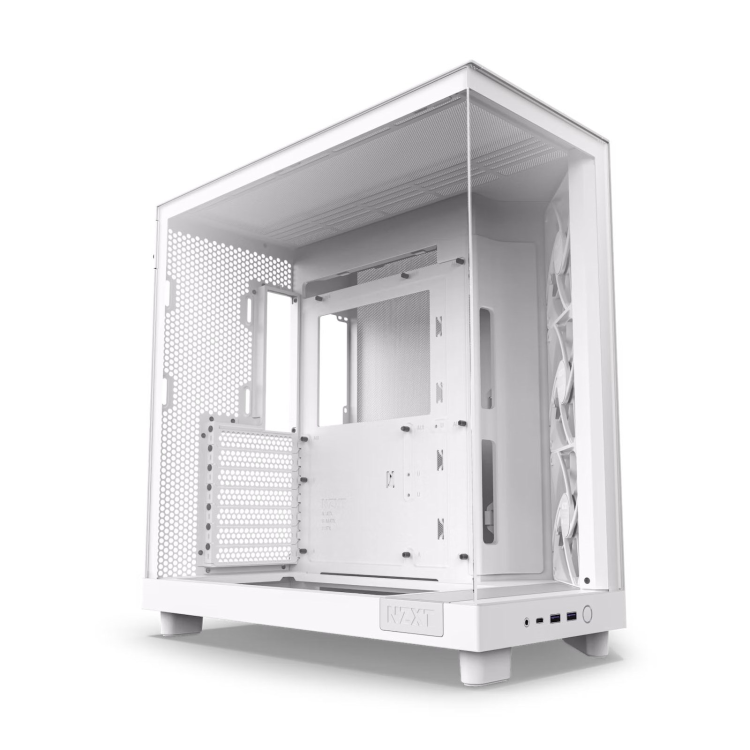 Experience performance with a fresh perspective. The H6 Flow's innovative compact design emphasizes GPU cooling with a strategically angled front corner, so the fans direct air where it's most needed. The panoramic glass proudly showcases the interior, while the dual-chamber layout frees up space for a cleaner look and better cooling performance.