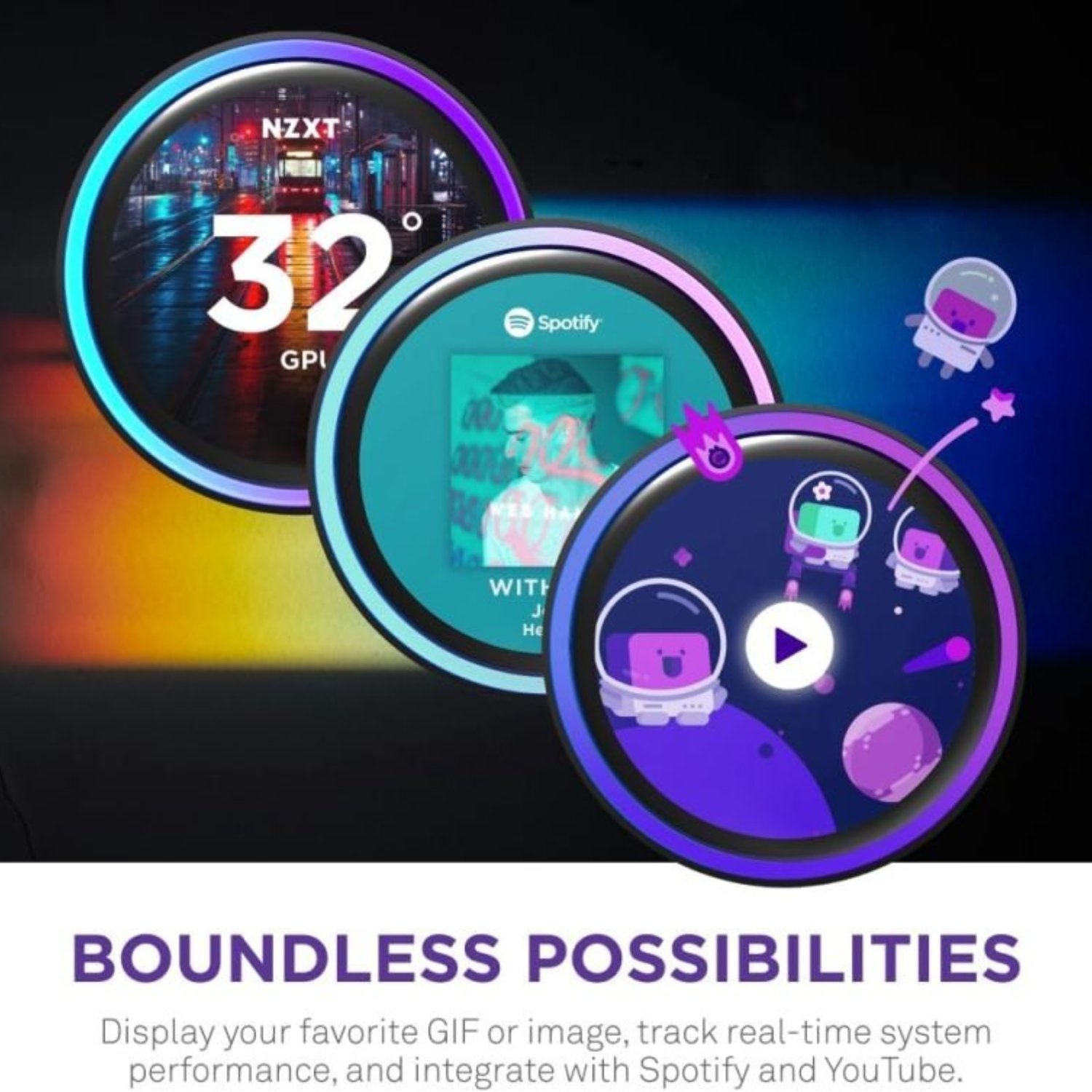 Get high-performance cooling, display a favorite animated GIF or static image, monitor real-time PC performance metrics, see music that's currently playing, stream browser content.