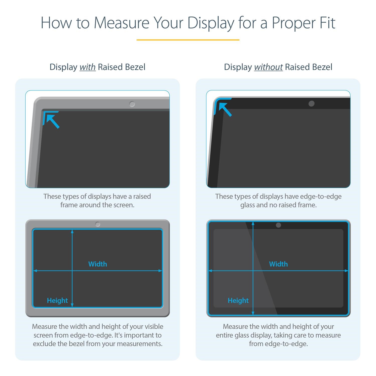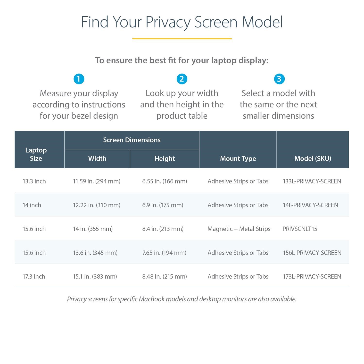 Notebook Privacy Filter| Blue Light Reduction | Matte or Glossy | 2-Year Warranty<br/><br/>Easy Magnetic Installation<br/><br/>The laptop privacy screen is very easy to install and remove. Simply attach the adhesive magnetic strips to the bezel of your display then align the notebook privacy filter with the strips. This black out privacy screen is also reversible. The matte side provides you with glare reduction and the glossy side of the privacy screen will provide you with increased clarity. In order to close and put your laptop to sleep the privacy screen must be removed. A protective folder is included so you can protect the privacy screen from damage when not in use. The privacy screen is also extremely easy to clean when removed from your laptop.<br/><br/>Protect your Privacy<br/><br/>The laptop privacy filter is a great investment if you want to protect your privacy. It is a convenient and cost-effective way to keep your classified information, intellectual property or any other important data you wish to keep protected. Whether travelling, working in the office or sitting in a busy coffee shop, you can have a peace of mind because you know your screen is protected with the 30+/- degree privacy viewing angle.<br/><br/>Blue Light Reduction<br/><br/>Lowering blue light exposure is important. To reduce digital eye strain, the monitor privacy film blocks between 40% to 51% of the blue light in the wavelength range of 380nm to 480nm.<br/><br/>Antimicrobial Protection<br/><br/>Our privacy screens feature an anti-microbial coating on the matte-side of the filter. Embedded antimicrobial technology provides protection against bacterial microbes by continuously eliminating up to 99.99% of certain surface bacteria. Antimicrobial screen protectors are ideal for environments where disinfection is important.<br/><br/>The Choice of IT Pros Since 1985<br/><br/>StarTech.com conducts thorough compatibility and performance testing on all our products to ensure we are meeting or exceeding industry standards and providing high-quality products to IT Professionals. Our local StarTech.com Technical Advisors have broad product expertise and work directly with our StarTech.com Engineers to provide support for our customers both pre and post-sales.<br/><br/>The TAA compliant PRIVSCNLT15 is backed by a StarTech.com 2-year warranty and free lifetime technical support.<br/><br/>The StarTech.com Advantage<br/>