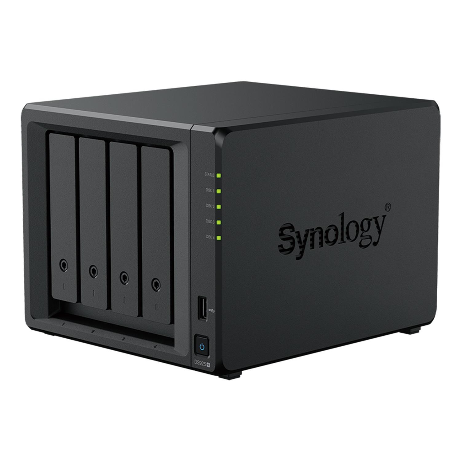 The DS925+ includes four drive bays compatible with Synology 3.5" SATA HDDs and 2.5" SATA SSDs, supporting up to 80 TB of raw capacity. It also features two M.2 2280 NVMe SSD slots for cache acceleration or dedicated SSD storage pools. With support for the DX525 expansion unit, total capacity can scale up to 180 TB across nine bays.