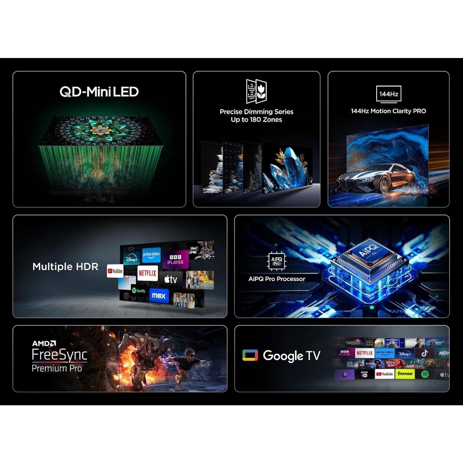 Experience exceptional contrast and colour with Quantum Dot and Mini-LED technology. Precision backlighting delivers deeper blacks, brighter highlights and enhanced detail for a more vivid and lifelike 4K picture.