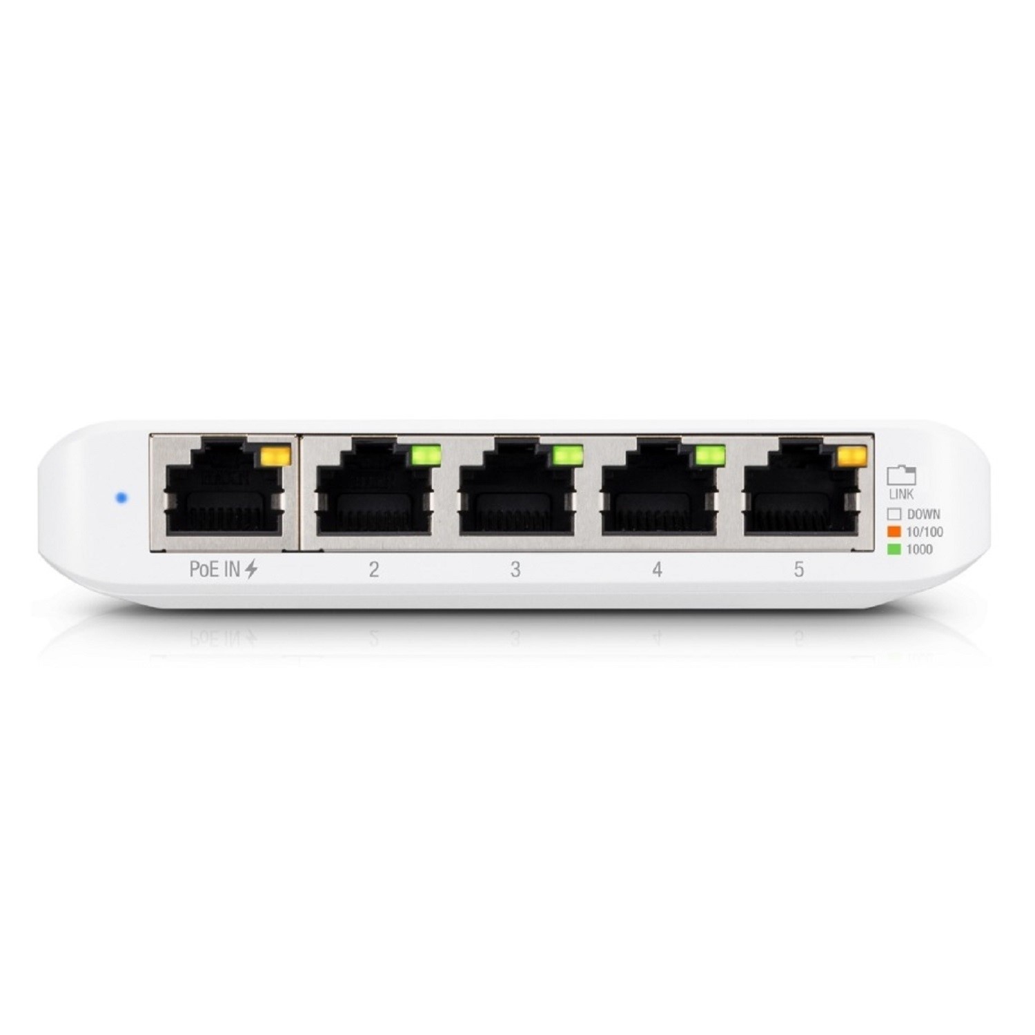 The USW-Flex features five Gigabit RJ45 ports to deliver robust performance and intelligent switching for your network. Port 1 provides PoE Input while ports 2-4 offer 802.3af PoE and provide up to 15W of power for your PoE devices. Products requiring 802.3af, such as G3 Flex cameras, are also supported.