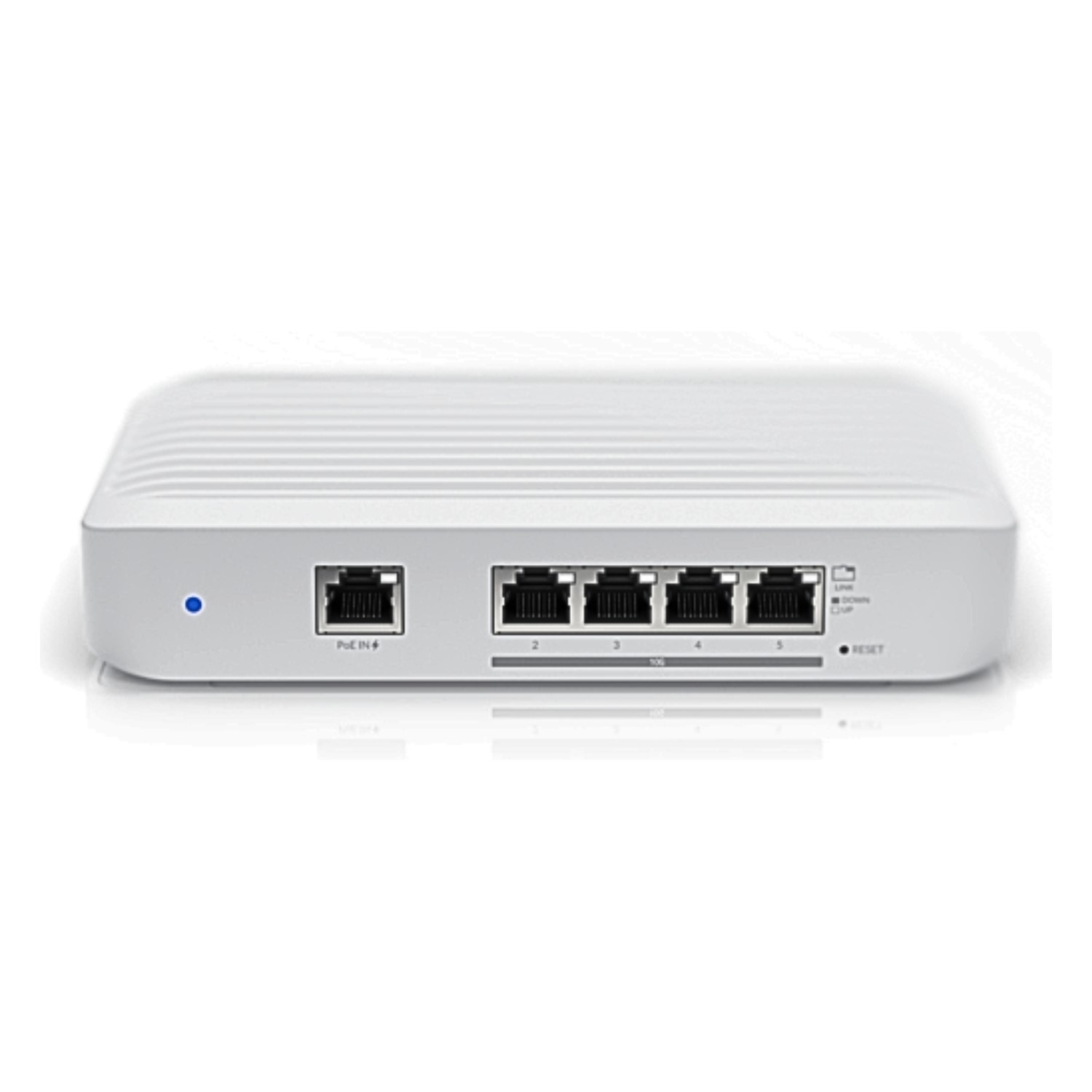 This switch features a Gigabit Ethernet input with Power over Ethernet Plus (PoE+) support, allowing it to receive power and data through a single RJ45 cable for easy deployment and management of connected devices.