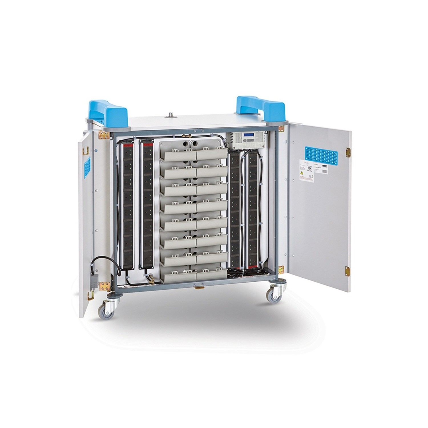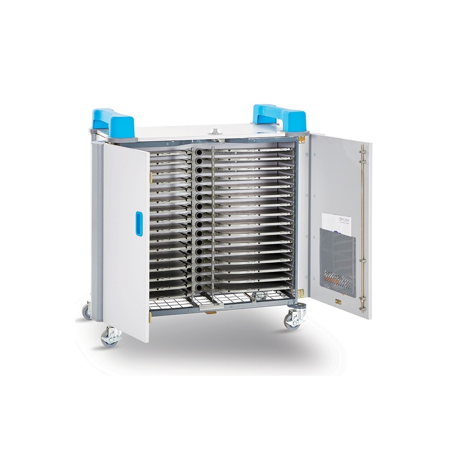 The LapCabby UniCabby 32H is designed to accommodate up to 32 tablets, notebooks, or Chromebooks, each with a screen size of up to 14 inches. This cart is perfect for educational institutions, offices, and healthcare environments that require secure, organized, and efficient device management.