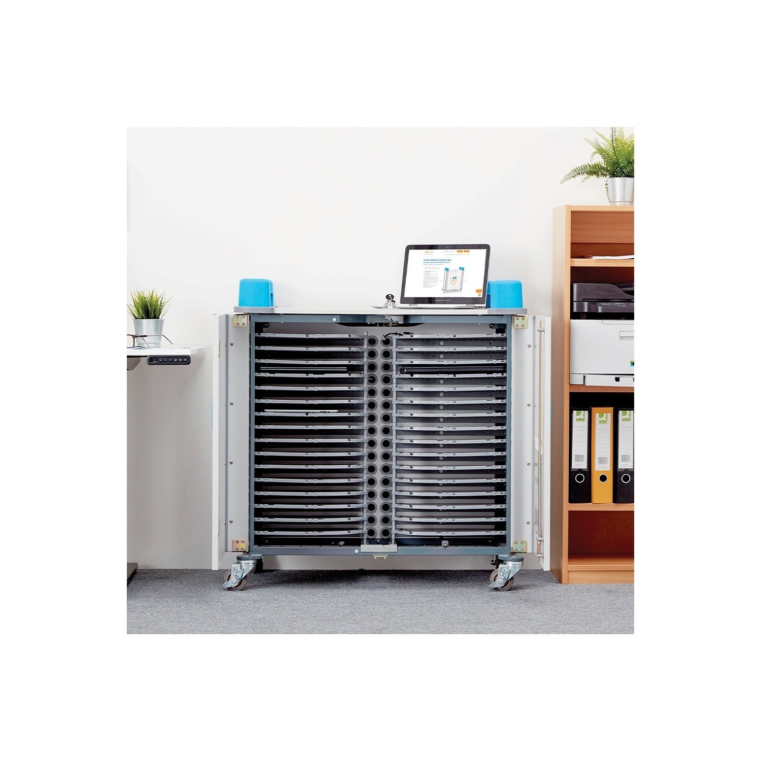 With heavy-duty castor wheels, this charging cart can be easily moved between classrooms, offices, or meeting rooms. The locking wheels keep the cart stable when stationary, adding another layer of security.